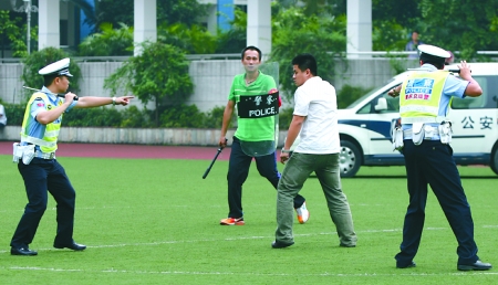 15時(shí)07分,一輛警車開進(jìn)操場(chǎng),8名全副武裝的飛龍突擊隊(duì)員跳下車門,迅速包圍操場(chǎng)中央圓弧。他們身穿多功能戰(zhàn)術(shù)背心,頭戴防彈頭盔,手握沖鋒槍,大腿外側(cè)還佩戴著手槍!胺畔聝雌鳌保幻粨絷(duì)員通過擴(kuò)音設(shè)備兩次喊話,但兩名持刀男子拒不就擒。