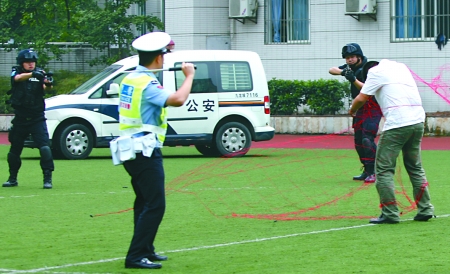 兩持刀男子沖進(jìn)九龍坡區(qū)一小學(xué),揮刀砍向攔阻他們的校園保安。正在危急時(shí)刻,端著沖鋒槍的飛龍突擊隊(duì)迅速出擊,兩張由網(wǎng)槍射出的紅色大網(wǎng)從天而降,將兩名男子圍住。5分鐘后,兩名持刀男子被擒獲。昨日下午,九龍坡區(qū)公安分局在天寶實(shí)驗(yàn)學(xué)校進(jìn)行了“飛龍2號(hào)”校園暴力事件處置演練。