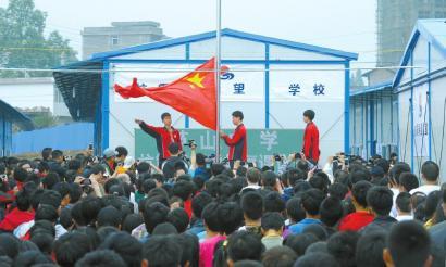 5月6日,蘆山中學的同學們在已經(jīng)建成的板房教室邊舉行升旗儀式。