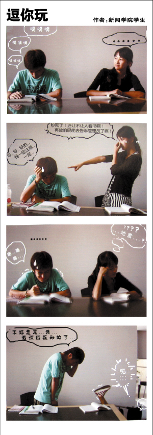何謂真人四格漫畫?就是每一格分別突顯開頭、發(fā)展、高潮和結尾以表現(xiàn)一個簡單而充滿寓意故事。此前在網(wǎng)絡上以真人漫畫一炮走紅的是“非常真人”組合,現(xiàn)在華工校園到處活躍著這樣的“非常真人”。