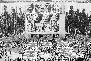 4時30分,7個白色巨幅繪畫陸續(xù)完成,每幅達(dá)50平方米,共1050平方米的白色巨幅上,分布21個“老萬”頭像,黑白顏色對比分明,很是壯觀。