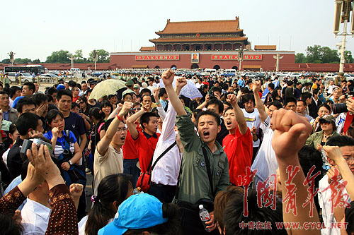 5月19日下午,天安門廣場(chǎng)上聚集了數(shù)萬名參與哀悼活動(dòng)的群眾,在默哀完畢后,此起彼伏的“中國萬歲”、“中國加油”的聲音響徹云霄。幾名四川籍在京大學(xué)生用四川話激昂高呼“四川雄起”,在場(chǎng)的四川人奮起響應(yīng),很快,來自全國各地的人們都受到強(qiáng)烈的震動(dòng),一起吶喊起來,一聲聲感人肺腑的吶喊聲在天地間回蕩,一雙雙舉著國旗的手臂在廣場(chǎng)上有力的揮舞,廣場(chǎng)漾起了一片血色的愛國暖潮。