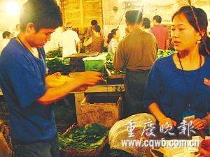 “愣在那兒干啥?吆喝幾句噻!”昨早7時30分,在模范村農(nóng)貿(mào)市場一菜攤,19歲的大一新生盛強,拿著一捆小白菜,對身旁發(fā)呆的同學(xué)劉芳說。盯著眼前一堆蔬菜看了老半天的劉芳,終于吆喝起來。