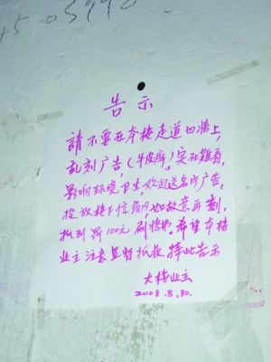 “請(qǐng)不要在本樓走道墻上亂刻廣告(牛皮癬)……如故意再刻,抓到罰100元,刷墻面!痹诙䲢l巷小區(qū)41號(hào)4單元一樓,記者看到了這樣的告示,貼在一面剛剛被重新粉刷過(guò)的墻上。爬上二樓樓道,這面墻也留著剛剛被粉刷過(guò)的痕跡,黑體大字書(shū)寫(xiě)的“告示”格外醒目。