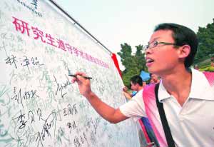昨日(23日)下午,華南理工大學舉行第十五屆研究生文化節(jié)開幕儀式,本屆活動的“學術道德宣誓”和“千人學術道德大簽名”屬高校首創(chuàng)之舉,上千名研究生由研究生會主席帶頭舉行學術道德集體宣誓尤其壯觀,并在簽名板上簽名,以表達對學術抄襲的反對態(tài)度。