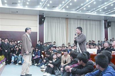 據(jù)了解,這場見面會并未對外界媒體公開,僅在校園BBS上發(fā)了個消息。晚7時30分,記者作為旁觀者坐到該校經(jīng)濟學院報告廳內(nèi),無意窺見了一場有意思的學生們所稱的“培根叔見面會”。