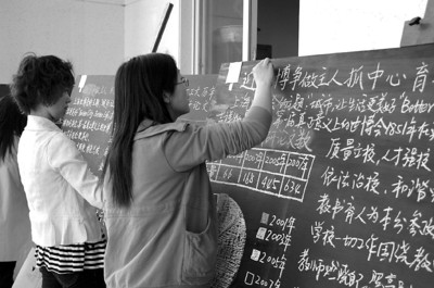 晚報訊 為提高教師教學(xué)基本功,上海第二工業(yè)大學(xué)日前舉行以“迎世博爭做主人、抓中心育人為本”為主題的教職工板書競賽,首次邀請學(xué)生做評委給老師打分。由各學(xué)院選拔出的35名教師分老、中、青三個年齡組進行比賽,評分標(biāo)準(zhǔn)由版面構(gòu)思合理、用規(guī)范字、筆畫清楚有力等方面組成。比賽裁判組邀請了各學(xué)院教學(xué)院長等18 人進行現(xiàn)場評分,同時首次邀請30位學(xué)生學(xué)習(xí)委員代表一起參與評分。比賽現(xiàn)場吸引了數(shù)百名教職工前來觀摩、取長補短! 跤浾 肖波 攝影 蔣世偉