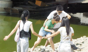 昨天上午9:00,大胡同附近的河邊傳來尖叫聲。循著聲音望去,只見河邊站著三名女孩,其中一名穿綠色T恤的女孩最靠近河水!皠e過來,你們再走一步我就下河!闭f著,女孩把一只腳踩進(jìn)水里,另外兩人見狀,只好停下腳步。幾個好心路人見狀趕緊拿出手機(jī)要報警,就在這時,幾名男女青年攔住了要報警的人。他們稱站在河邊的三個女孩都是他們的同伴,她們是在“演戲”,不會真的輕生,聽到這兒眾人才算放心。
