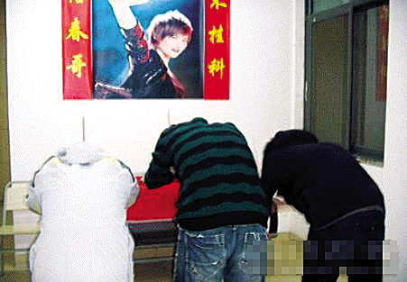 他與寢室同學(xué)商量,方案馬上得到全票通過。于是大家開始分工行動:去文星鎮(zhèn)買香爐、蠟燭與香,在學(xué)校商業(yè)街上的廣告公司訂制1×1.2米寬的李宇春海報。不久,寢室就被精心布置好了。上供品,燒高香,三鞠躬,儀式相當(dāng)隆重。90后的小馬不無驕傲地向記者透露,這個點子絕對原創(chuàng),全國僅此一家。