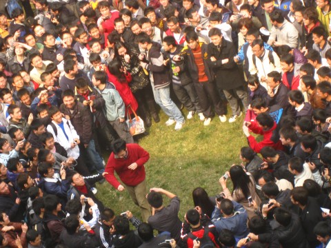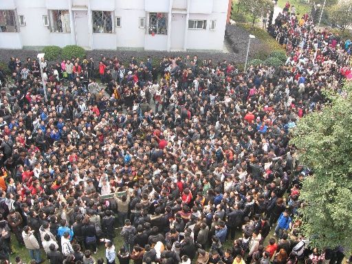 到今日中午,更有上千名“慕名”前來的校內(nèi)外學(xué)生在女生所指定的樓下“圍觀”,等待著膽大的男生前來呼叫女主角,附近學(xué)校甚至有學(xué)生“組團(tuán)”前往,并不斷有網(wǎng)友上網(wǎng)發(fā)帖報(bào)告事件進(jìn)展。據(jù)網(wǎng)帖稱,稍后有一穿紅衣男子前來表白,將現(xiàn)場(chǎng)引向高潮。