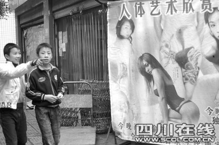 記者在觀察的10多分鐘發(fā)現(xiàn),先后有宜賓縣育才中學(xué)、柏溪小學(xué)的100多名小學(xué)生從這里經(jīng)過(guò),部分學(xué)生圍在宣傳畫(huà)前指手畫(huà)腳。在電影院附近開(kāi)店的彭先生不無(wú)憂慮地告訴記者:“孩子們肯定會(huì)受到影響的!