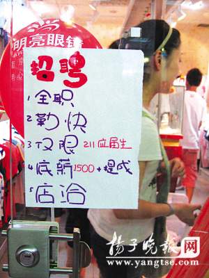“招聘:全職,勤快,僅限211應(yīng)屆生,底薪1500+提成,店洽”。這家名為“彩虹糖”的外貿(mào)服飾店門口貼出的招聘啟事20字左右卻沖擊力十足,其中“僅限211應(yīng)屆生”部分還用紅色筆著重標(biāo)出。