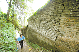 昨日下午5時(shí)左右,記者在現(xiàn)場(chǎng)看到,土堆有10多米高。在土堆最頂部,有一條貫通的裂縫,裂縫最寬處有8厘米左右。因受前晚昨晨的大雨沖刷,已無(wú)法確認(rèn)其是否是新發(fā)生的裂痕。土堆底部緊靠一堵圍墻,圍墻外是一條石板路,土堆最高處已堆至圍墻腰部。一部分圍墻已經(jīng)不存在——今年3月中旬的一場(chǎng)大雨后,土堆沉降,將這部分圍墻推倒。仍存的部分墻體,也已有松動(dòng)跡象,并有裂縫朝石板路一側(cè)發(fā)生傾斜。