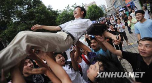 6月8日,學(xué)生們將班主任舉起歡慶,小偷(右下)趁機偷竊班主任手臂上的皮包。6月8日下午,2009年全國高考湖南考區(qū)考試結(jié)束。在長沙市一中考點門口,由于考生家長眾多,吸引了趁亂行竊的小偷。其中一群考生在將班主任高高舉起慶祝之際,一名小偷趁亂偷走了班主任的皮包。師生和記者發(fā)現(xiàn)皮包丟失后,根據(jù)記者提供的圖片尋找小偷,但小偷已逃之夭夭。新華社記者李尕攝