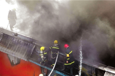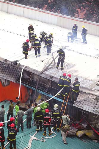 采石路消防中隊(duì)和首體南路消防中隊(duì)出動(dòng)10輛消防車相繼趕到,消防員向屋頂噴水后,攀上樓頂鑿開屋頂彩鋼板向內(nèi)噴水。很快,明火被撲滅。消防員需一人指引進(jìn)入教室,小石便自告奮勇領(lǐng)路。小石說:“教室有一個(gè)籃球場大,里面有音響設(shè)備和椅子等物,當(dāng)時(shí)屋內(nèi)濃煙滾滾。”他隨即撤出,消防員繼續(xù)進(jìn)行撲救。