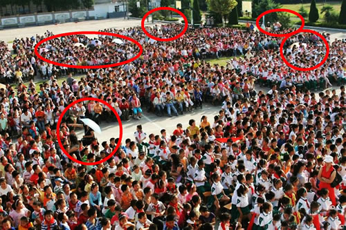新學(xué)期開(kāi)學(xué)后的一天下午,時(shí)值“秋老虎天氣”,氣溫達(dá)到三十四度,濱?h實(shí)驗(yàn)小學(xué)兩千余名小學(xué)生服裝整齊地聚集在烈日下的大操場(chǎng)上舉行秋學(xué)期開(kāi)學(xué)典禮。次日,該縣教育網(wǎng)站發(fā)了題為《濱?h實(shí)驗(yàn)小學(xué)舉行2009年秋季開(kāi)學(xué)典禮》的報(bào)道,隨文還配發(fā)了三幅圖片,其中有一圖片顯示,密密麻麻的學(xué)生方陣中,約有十位女教師打傘防曬。