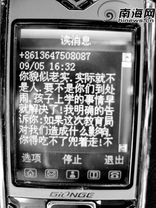 他們得知,曙光學校有兩名學生的分數(shù)超過了臨高中學的錄取分數(shù)線,卻不能上臨高中學,只能轉讀臨高二中,家長找曙光學校交涉,該校自知理虧,給兩名學生各賠了2000元。于是,他們幾人也找到曙光學校校長王文進,要求退錢。對方非但沒退錢,反而發(fā)短信辱罵了他。