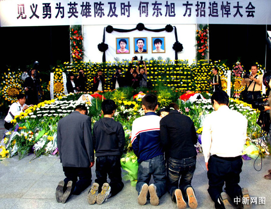 上午的追悼會由荊州市委副書記傅立民主持。長江大學(xué)黨委書記張忠家在悼詞中說,三名19歲的大學(xué)生為搶救他人生命,卻不幸離我們而去。我們?yōu)橹矗瑸橹袆。陳及時、何東旭、方招同學(xué)舍己救人的事跡震撼了古城、感動了全國!幾天以來,學(xué)校師生和社會各界人士,以多種方式表達(dá)崇敬和哀思。他們的英雄壯舉是良好的家庭教育、學(xué)校教育、社會教育和自我教育的結(jié)果。