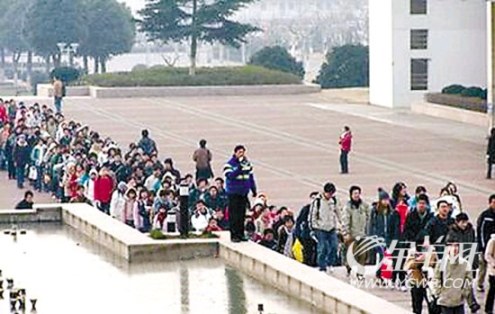 據(jù)瀟湘晨報報道,日前,網(wǎng)友“隨風(fēng)”在網(wǎng)上公布了一篇來自校內(nèi)網(wǎng)的日志,除了文字外還附帶8張照片,圖文并茂地描述了南京師范大學(xué)學(xué)生,在一個雨夾雪的寒冬清晨,在圖書館門前排起了綿延數(shù)百米的長隊,幾乎看不到頭。兩天里有近2000網(wǎng)友跟帖熱議,有人不相信這是真的。