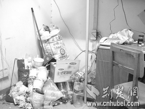 據(jù)記者了解,B棟所住的均為該校的男大學(xué)生。這行粉筆字寫在樓道的地上,記者趕到時,字跡已經(jīng)十分模糊了。在知情學(xué)生的指引下,記者進(jìn)入6樓一間寢室。一進(jìn)門,一陣怪味就撲面而來。四下仔細(xì)一看,寢室門后一個高近一米的垃圾堆赫然出現(xiàn)在記者眼前:用過的飯盒、塑料袋,甚至是煙頭、飲料瓶,各式垃圾堆滿一地。但在這種環(huán)境下,寢室里的4個男生卻好像絲毫沒有察覺,上網(wǎng)、看書不亦樂乎。該寢室學(xué)生小程告訴記者,他們每天的學(xué)習(xí)任務(wù)都比較重,課余時間一些同學(xué)又流連網(wǎng)絡(luò),因此大家平時都不愿意做清潔,寢室里形成這么個垃圾堆也“不足為奇”!安贿^通常我們隔一個月會清除一次的!毙〕陶f,冬天把垃圾堆在寢室里也沒多大關(guān)系,夏天會清除得比較及時。而小程所說的“清除”,就是把垃圾從室內(nèi)掃到寢室門口堆放,等宿管做清潔的時候一并清理!捌鋵嵨覀兊纳罾菓(yīng)該自己拿到樓下的垃圾桶里扔掉的,但很多同學(xué)為了省事,就直接把垃圾堆在門口,這樣增加了宿管做清潔的勞動量,最后才發(fā)生了她們寫‘大字’抱怨的事情。”