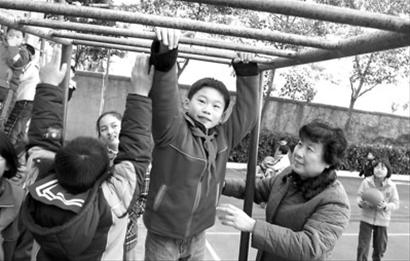 四年級(jí)的汪強(qiáng)投籃不小心摔倒在地,陶阿姨立即跑上前幫忙;四年級(jí)的幾位男生喜歡吊單桿,陶阿姨站在一邊做保護(hù)……今天早晨7:40,記者在浦東南路小學(xué)看到,護(hù)導(dǎo)老師和保安在校門口迎接每一位到校的學(xué)生;提前到校的學(xué)生,在附近居民志愿者的指導(dǎo)下,在操場(chǎng)上參加各種體育運(yùn)動(dòng)。