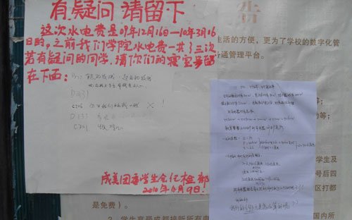 隨后,該校后勤部工作人員張貼了一份通知向學生解釋。通知寫道:“該表為學生公寓2009年9月~2010年3月學生公寓應交水電費;實際計量水、電月份分別為2009年10月、11月、12月,2010年1月、3月(1月10日~2月28日寒假)!