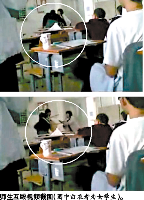 然而,該女生毫不示弱,拿起凳子扔向老師。打斗場面并未結(jié)束,老師再從一邊撿起該女生砸來的板凳回敬了該女生,兩人一直廝打到教室門口處,直到一教師模樣的人從門外沖進(jìn)教室,雙方才結(jié)束“戰(zhàn)斗”。