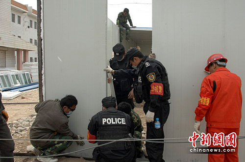 當(dāng)天下午,由成都公安特警30名青年民警組成的突擊隊(duì)與建材集團(tuán)員工一起先用挖土機(jī)將地面推平,然后隊(duì)員們分工合作、用帶來(lái)的發(fā)電機(jī)迅速發(fā)電,有的切割泡沫板,有的在鋼板上鉆孔,有的拼接泡沫墻面,在“5.12”抗震救災(zāi)時(shí)掌握的“施工技術(shù)”在這兒全用上了。這時(shí)的天空又一次飄起了雨夾雪,寒氣襲人,但特警隊(duì)員們?nèi)匀桓蓜攀。由于高原缺氧,一名?duì)員在劇烈搬送后出現(xiàn)了頭暈癥狀,其他隊(duì)員馬上將他扶到一旁休息,另一名隊(duì)員立即替補(bǔ)上去,他們就這樣輪番著作戰(zhàn)。在拼接板墻的時(shí)候,由于風(fēng)沙很大,隊(duì)員們眼睛、嘴里全是沙,但他們顧不了那么多,心中只有一個(gè)信念:就是以最快速度將板房建好,讓災(zāi)區(qū)的同學(xué)們?cè)缛諒?fù)課,參加學(xué)習(xí)。