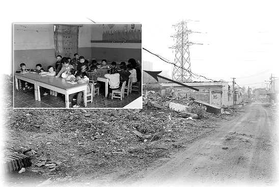 杭州豐潭路邊的方家塘村早就開始拆遷了,現(xiàn)在周圍已經(jīng)沒有居民,可是唯獨村中的幼兒園卻遲遲沒有搬遷,孩子們?nèi)匀辉趶U墟里上課。廢墟中的幼兒園成了一座孤島。