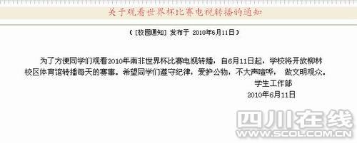 西財(cái)在校學(xué)生小徐在本報(bào)大成網(wǎng)新聞報(bào)料臺(tái)轉(zhuǎn)發(fā)了這則通知:“2010年南非世界杯開幕在即,世界杯比賽期間正值國(guó)家英語(yǔ)四六級(jí)考試和期末復(fù)習(xí)考試階段,為了維護(hù)學(xué)校的正常教學(xué)和生活秩序,確保同學(xué)們能夠正常的休息,以良好的狀態(tài)溫課迎考,應(yīng)廣大同學(xué)和學(xué)生家長(zhǎng)的要求,學(xué)校決定自6月11日起至賽事結(jié)束,學(xué)生公寓熄燈以后校園網(wǎng)絡(luò)也將暫停使用!