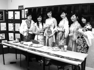 絢麗的旗袍和女孩子們的笑容贏得了極高回頭率。很多英國人來問哪里可以買到旗袍。姑娘們就抓住這個機會向外國學(xué)生介紹中國的餃子、書畫等。