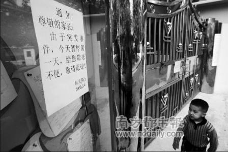 在公開信的邊上還貼著一份機(jī)關(guān)四幼的通知,稱“由于突發(fā)事件,今天暫停課一天”。在這份通知的左下角,有人用圓珠筆歪歪扭扭地寫下了不滿:“家長(zhǎng)要求退還所有費(fèi)用,到其他學(xué)校上學(xué)。”