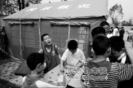 19日10時30分:谷勝聰坐在初一教學(xué)部的電腦前,15平方米大的帳篷里坐著近10名老師。檢查過記者的證件后,谷勝聰拿出一包潤喉糖,拿出一顆后又塞進(jìn)包里。