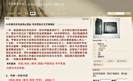 據(jù)“傳播小王子”反映,這些販賣試題的廣告不僅在各大考研論壇上蔓延,而且在QQ群、百度貼吧等處也是層出不窮,甚至有人開(kāi)博客公然叫賣。而服務(wù)的種類從考前一天提供考試答案到考場(chǎng)中“在線服務(wù)”不一而足。