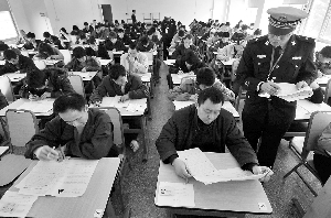 昨日早上剛到8:00,不少心急的考生已經(jīng)來(lái)到位于廣州城市職業(yè)學(xué)院廣園校區(qū)的交通協(xié)管員筆試考場(chǎng)!澳挲g小、學(xué)歷高的并不占絕對(duì)優(yōu)勢(shì)!苯痪ш(duì)政治處副主任、昨日的副主考官?gòu)埾鏉嬖V記者,報(bào)名者中不乏一些大專、本科學(xué)歷的人士,還有一個(gè)碩士研究生,但無(wú)奈視力不好體檢關(guān)過(guò)不了,無(wú)緣筆試。