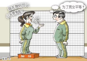 對(duì)于合理性的要求,則應(yīng)該再仔細(xì)商榷!芭⒃谏敫咧谢蚴泄芨黝愔袑、職業(yè)學(xué)校時(shí),筆試總成績(jī)加2分!睆默F(xiàn)實(shí)來(lái)看,女孩的考試能力并不比男孩差,這樣的差別待遇,可能不具有說(shuō)服力。