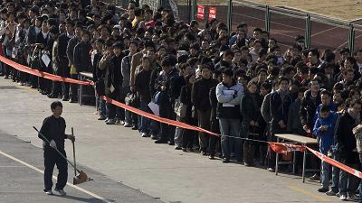 為了找工作,昨日(13日)清晨不到6時,天剛微微亮,許多大學(xué)畢業(yè)生就提前近3小時排起了長隊。