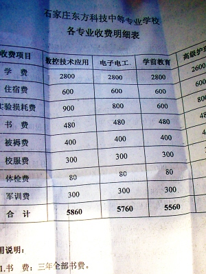 如果學(xué)生想自己找實習(xí)單位,就要交3000元錢。其中1000元是注冊費,2000元是伙食費。“我們是與石家莊協(xié)和醫(yī)學(xué)院聯(lián)合辦學(xué)的,發(fā)的是那所學(xué)校的畢業(yè)證,注冊什么的都需要錢,這個錢就得學(xué)生來出!边@位老師說,從去年5月份開始,學(xué)校的食堂就對學(xué)生和教職工免費開放了。小張去年7月從廣東打工回來,暑假后來上學(xué),從9月到現(xiàn)在,在學(xué)校免費吃了7個月的飯,按每月300元算,是2100元,學(xué)校收2000元是合適的。
