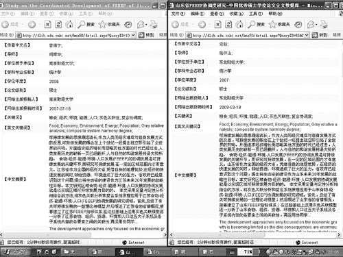 昨天(25日,下同)下午,記者按照這名網(wǎng)友提供的信息,登錄中國知網(wǎng),分別下載了這兩篇碩士論文。
