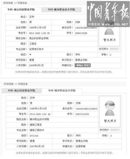 從學(xué)籍科老師處知道自己的身份可能被盜用的消息后,王帥登錄中國(guó)高等教育學(xué)生信息網(wǎng)查詢。他發(fā)現(xiàn)自己的身份下有兩個(gè)學(xué)籍信息,一個(gè)是自己2007年入學(xué)的隨州職業(yè)技術(shù)學(xué)院,另一個(gè)則顯示為:2006年9月1日入學(xué)商丘科技職業(yè)學(xué)院工程系應(yīng)用電子技術(shù)專業(yè),學(xué)制三年?疲瑢W(xué)籍狀態(tài)為已畢業(yè)。后者的姓名、出生日期、身份證等信息均與自己相同,考生號(hào)則為自己第一年參加高考的準(zhǔn)考證號(hào)。兩個(gè)學(xué)籍信息均沒有照片。