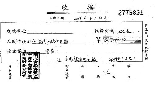 6月15日,學(xué)校籌集了45萬元現(xiàn)金,匯給了楊某的指定賬戶。令人意外的是,這個賬戶并不是學(xué)校的公共賬戶,而是一個名叫“王貞”的私人賬戶。等他們拿到收據(jù)后,上面蓋的公章是“湖北省經(jīng)濟(jì)管理干部學(xué)院博智教學(xué)站”。