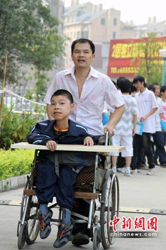 中新網(wǎng)宜昌6月20日電(記者 劉良偉 上官純青)20日,湖北宜昌7.7萬名學(xué)子參加了當(dāng)?shù)氐闹锌,這其中有一位特殊的孩子——宜昌市十五中905班的王宇,在父親的陪伴下,來到當(dāng)?shù)貙iT設(shè)立的特殊考生考場(chǎng)參加了考試。十多年來,父親王忠(化名)為患有罕見的肌肉營(yíng)養(yǎng)不良癥的王宇,和妻子沒有放棄,用人間真愛一路陪伴著兒子,無論風(fēng)吹雨淋,他都執(zhí)著地背孩子上學(xué),并自己鉆研醫(yī)學(xué),以身試藥,用真心真愛演繹著平凡人生里不朽的傳奇。