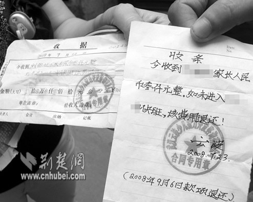 據學生家長易女士介紹,她家住漢口頭道街,小孩今年剛剛讀初一。一年前,孩子讀六年級的時候,她在家附近的“武漢博淵培優(yōu)公司”給孩子補習數學。7月12日,小孩回家后告訴她說,培優(yōu)老師稱他在附近的中學有關系,可以介紹學生進快班,不過要收取3000元錢。于是,易女士交給了培優(yōu)老師3000元錢,并拿到了一張收條。收錢方承諾,進不了快班就退錢,落款名為“云波”。