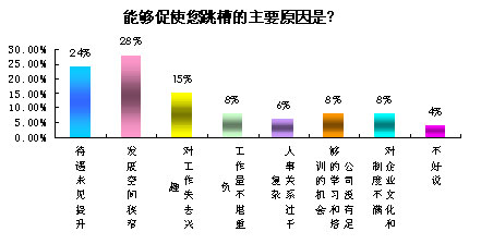 調(diào)查中也發(fā)現(xiàn)令職場人士下定決心跳槽的幾大因素。受訪人士中16%的人士選擇“有較高的收入或是職位”,13%的人士選擇“更好的學(xué)習(xí)機會和積累過程”,其次包括公司規(guī)模、是否工作繁忙等等都成為選擇重要依據(jù)。這和另一項調(diào)查“什么情況下會拒絕Offer”基本相對應(yīng)。職位和薪水和心理預(yù)期落差太大成為拒絕Offer的主要因素。