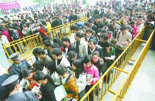經(jīng)兩天“海選”,由成都市人事局主辦、成都人才市場承辦的2008成都冬季特大型人才招聘會暨高校畢業(yè)生供需洽談會,昨日(11月16日)在世紀(jì)城新會展中心正式落幕。作為今冬規(guī)模最大的一次特大型招聘會,今年只有324家企業(yè)攜6226個崗位前來“選秀”。盡管招聘單位和崗位數(shù)量大幅縮水,但兩天時間里求職大軍數(shù)量仍逼近7萬。