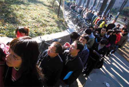 昨日(20日,下同)上午,清華大學,求職學生在招聘現(xiàn)場門外排起長隊。因人數(shù)較多,校方一度限制學生進場。到11時,隊伍超過兩百米。本報記者 薛珺 攝