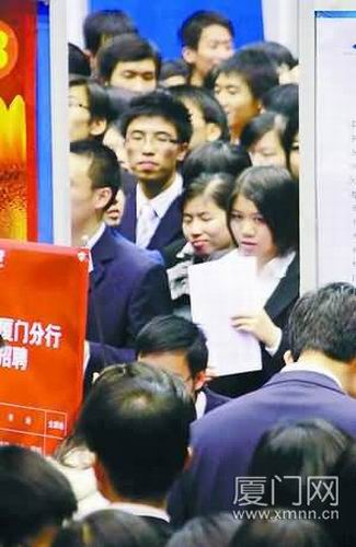 當(dāng)日在廈大召開的畢業(yè)生招聘會(huì),是廈大每年為自己的畢業(yè)生舉辦的,不過(guò),幾乎省內(nèi)的大學(xué)都有人趕去參加,使得廈大這一年一度的招聘會(huì)首次實(shí)行門禁——依照人流量分時(shí)段放人入場(chǎng),有的畢業(yè)生花了一小時(shí)才遞上一份簡(jiǎn)歷。