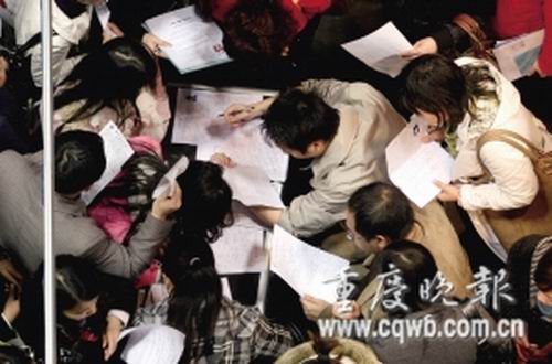 沙坪壩區(qū)人才市場舉行房地產(chǎn)開發(fā)類專場招聘,結果進場的大型知名地產(chǎn)開發(fā)企業(yè)為零,一個售樓員職位,上百人搶。