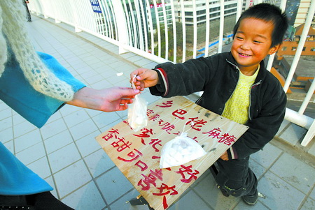 昨天下午3點(diǎn),菜園壩長(zhǎng)江大橋人行道上,一名小男孩坐在小板凳上,他面前的小攤上,擺著一袋袋麻糖!拔屹u的麻糖很甜!毙∧泻⑿χ凳。有顧客彎腰,問(wèn)他幾歲了,小男孩笑著回答:“我6歲半了,讀一年級(jí),麻糖1元一袋!庇兄心昱繋е10多歲的女兒走過(guò),給女兒掏錢買麻糖,并教育女兒道:“你看人家這么小,就開始做生意了!