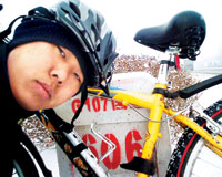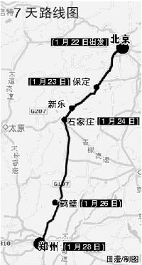 由于沒(méi)有買(mǎi)到回老家鄭州的火車(chē)票,北航的大二學(xué)生高富松決定騎自行車(chē)回家。他1月22日從北京出發(fā),歷時(shí)7天抵家,目睹了冰雪對(duì)沿途居民的影響。昨天,高富松興奮地告訴記者,雖然路上經(jīng)歷了不少困難,但堅(jiān)持到最后的精神讓自己平安到家,而且這次經(jīng)歷也考驗(yàn)了自己的耐力。